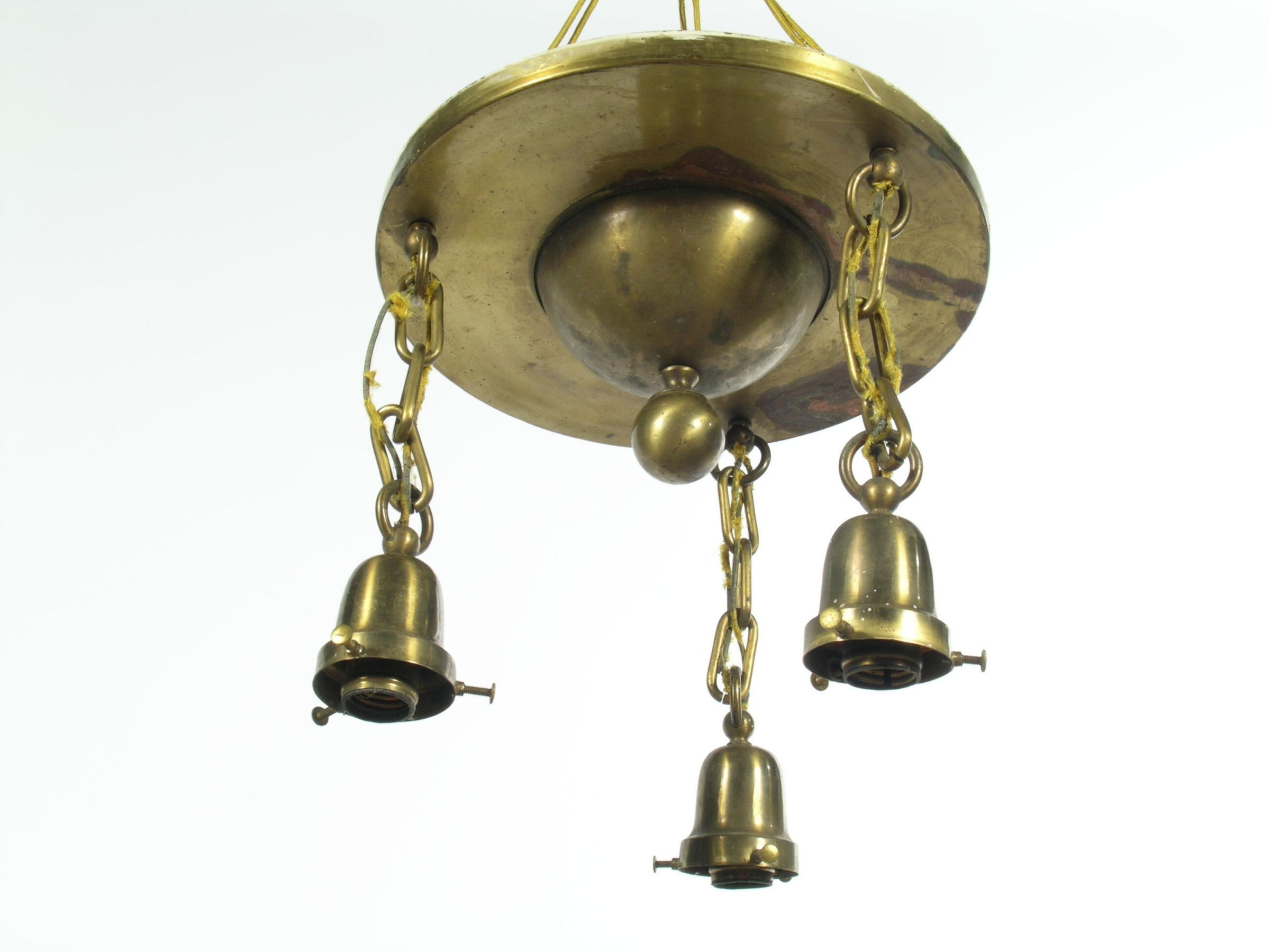 3 sockets hang from chains from 2 piece ceiling canopy.