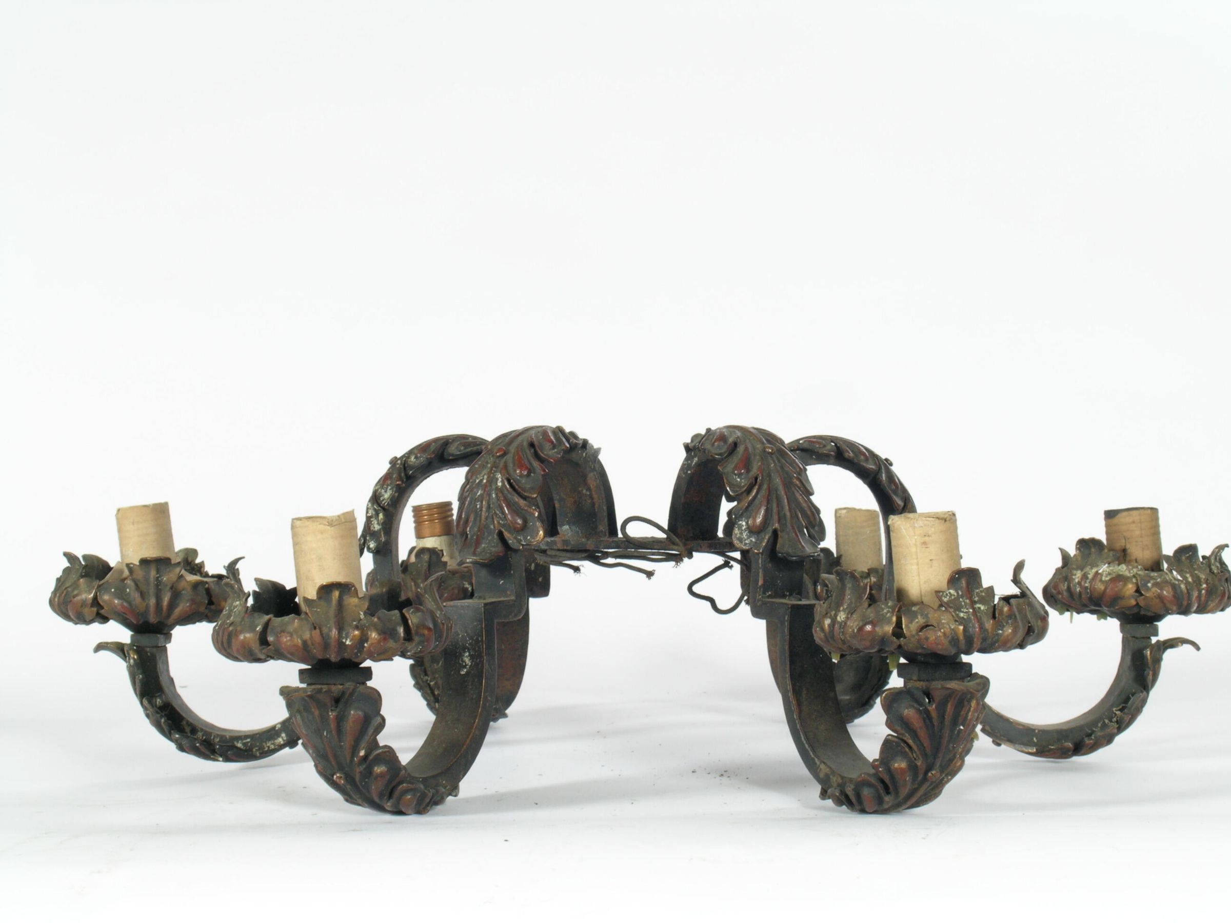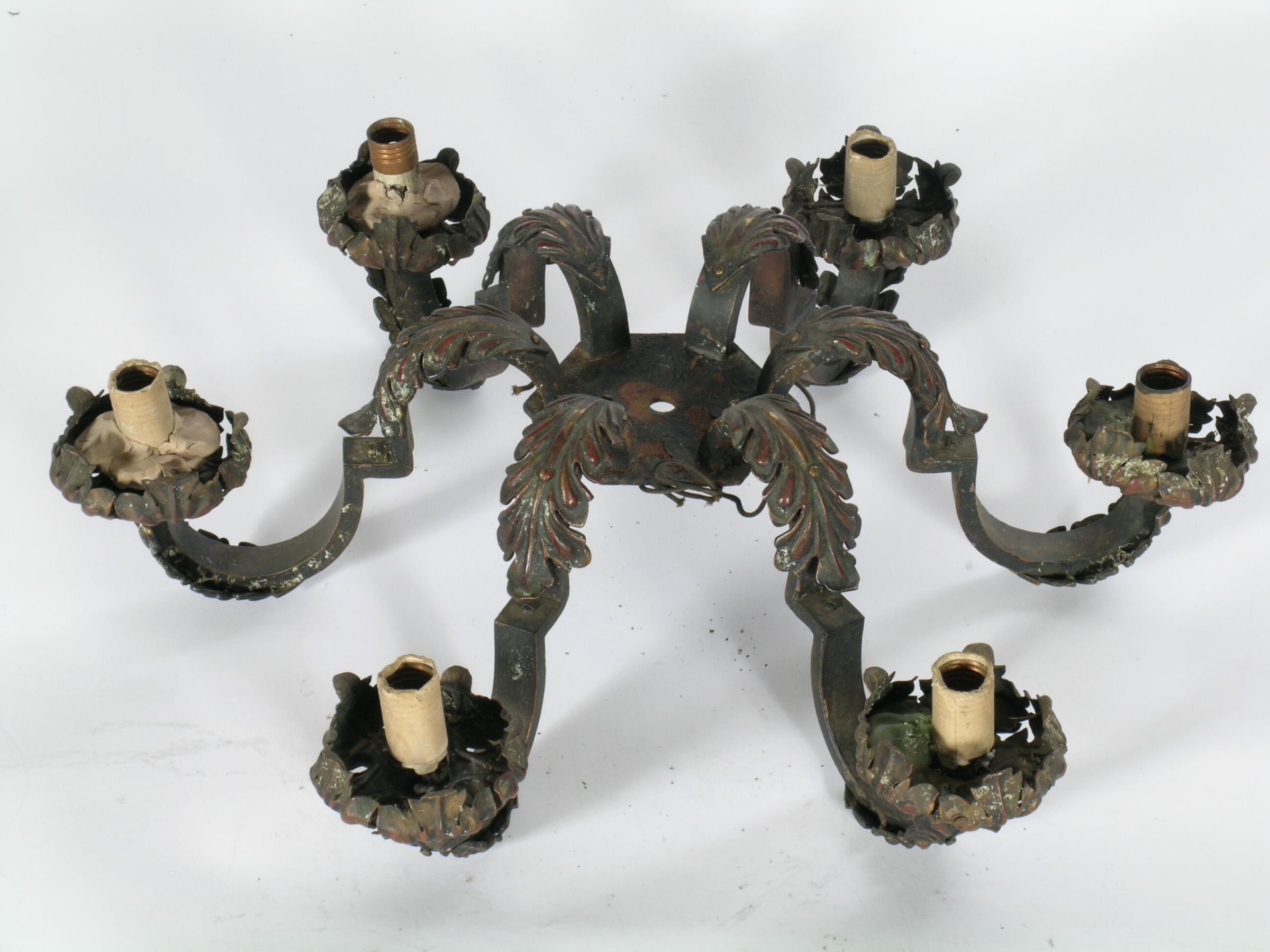 Iron ceiling chandelier. 6 arms. Acanthus leaf motif. Shades: None Fuel: Electric Finish: Polychrome
