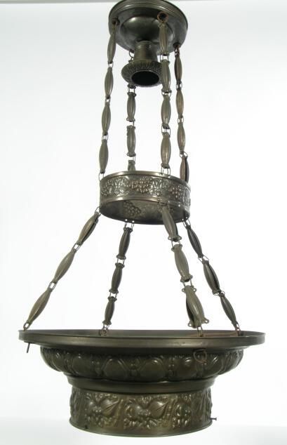European style brass ceiling chandelier. 1 light @ ceiling canopy; 3 stamped link chains to break ring, then to large ring with light.