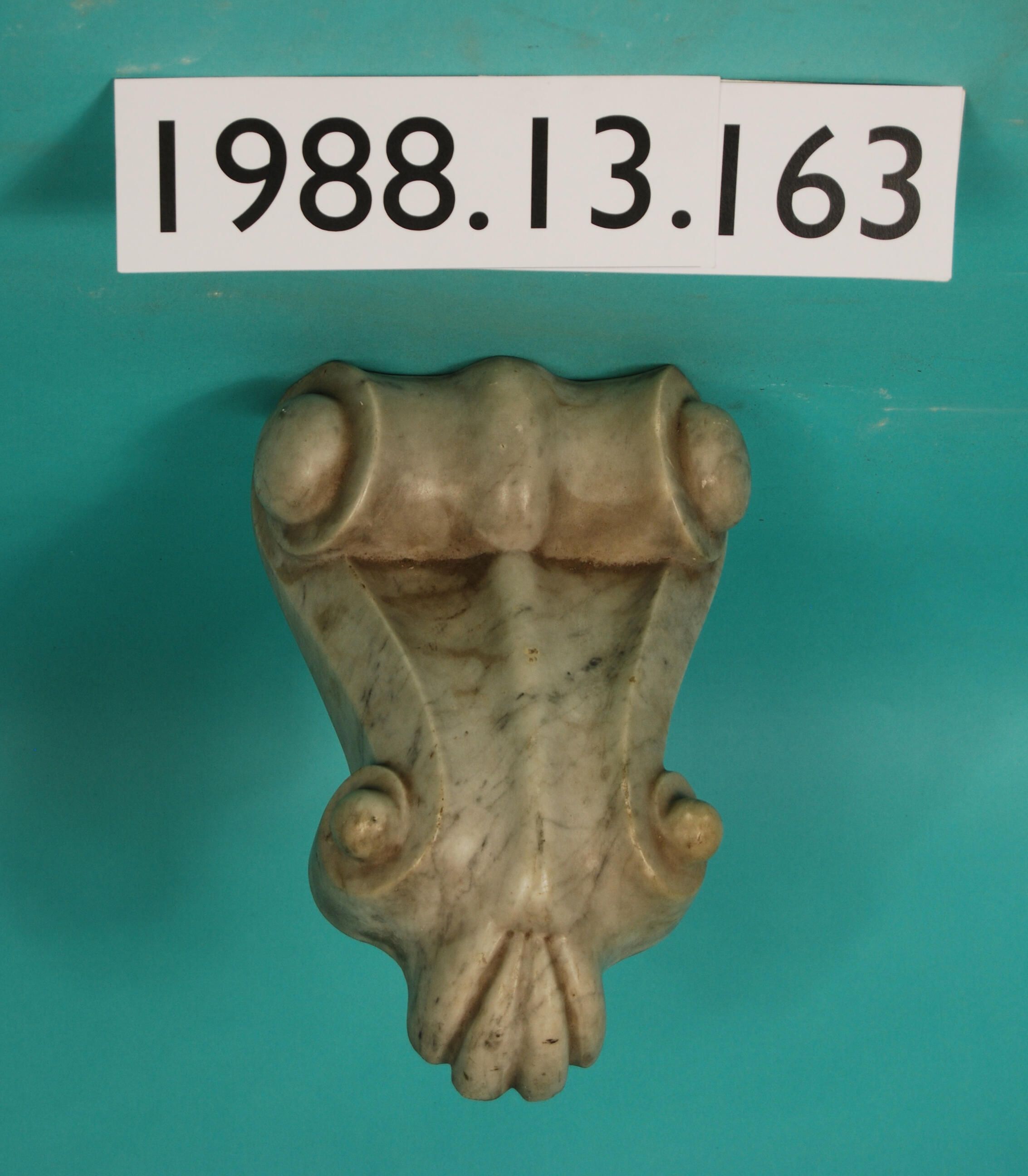Carved white / gray veined polished marble mantle keystone with scroll motif. From fireplace mantle. One of two matching pieces.