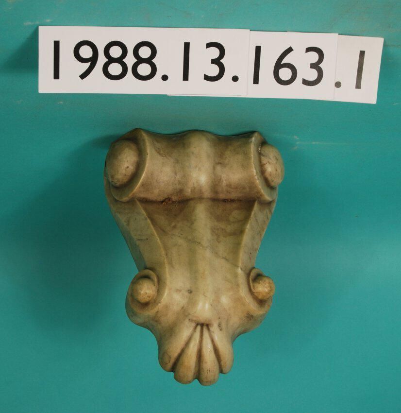 Carved white / gray veined polished marble keystone with scrolled motifs. From mantle. One of a pair.
