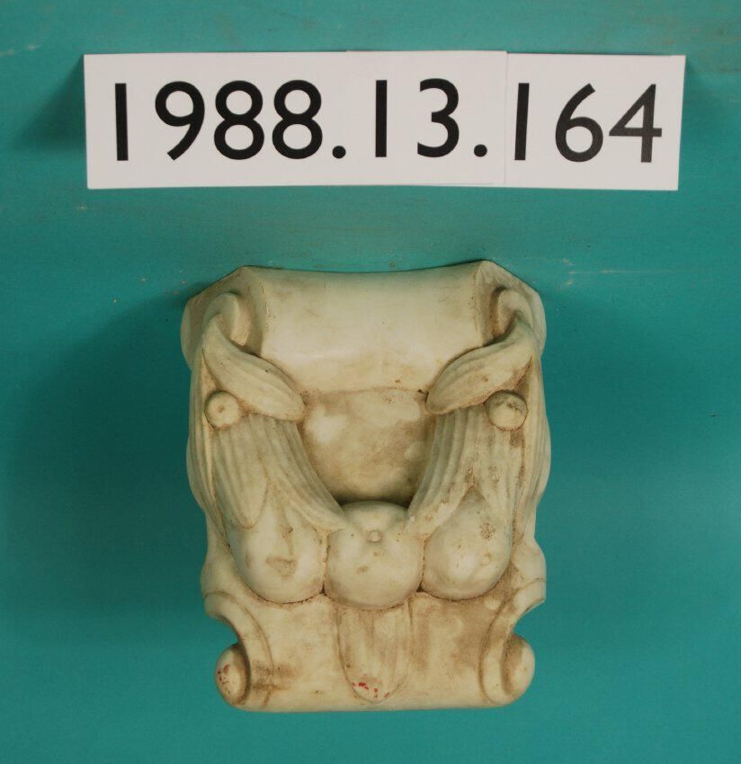 Carved white polished marble fireplace mantle keystone. Botanical and scroll motifs. One of two similar pieces.
