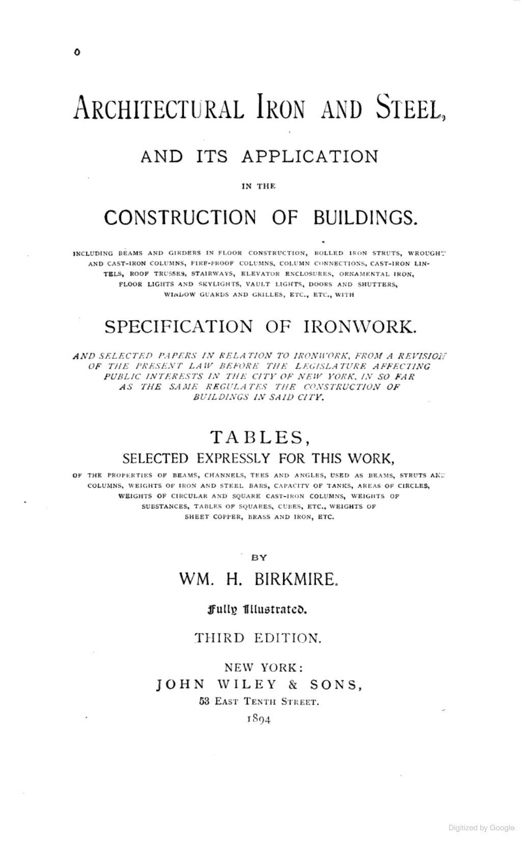 Architectural iron and steel, and its application in the construction of buildings ... with specifications of ironwork. And selected papers in relation to ironwork, from a revision of the present law before the Legislature affecting public interests in the city of New York ... Tables ... of the properties of beams, channels ... etc. By Wm. H. Birkmire ...Entry/Object ID