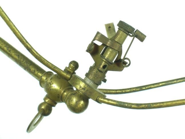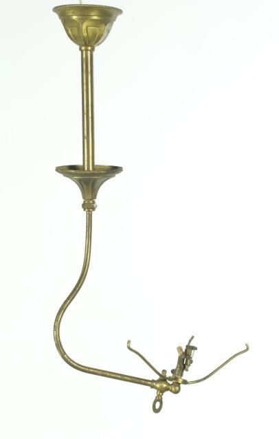 Victorian Vernacular; Colonial style ceiling chandelier. Shade: Fuel: Asytelene Finish: Brushed