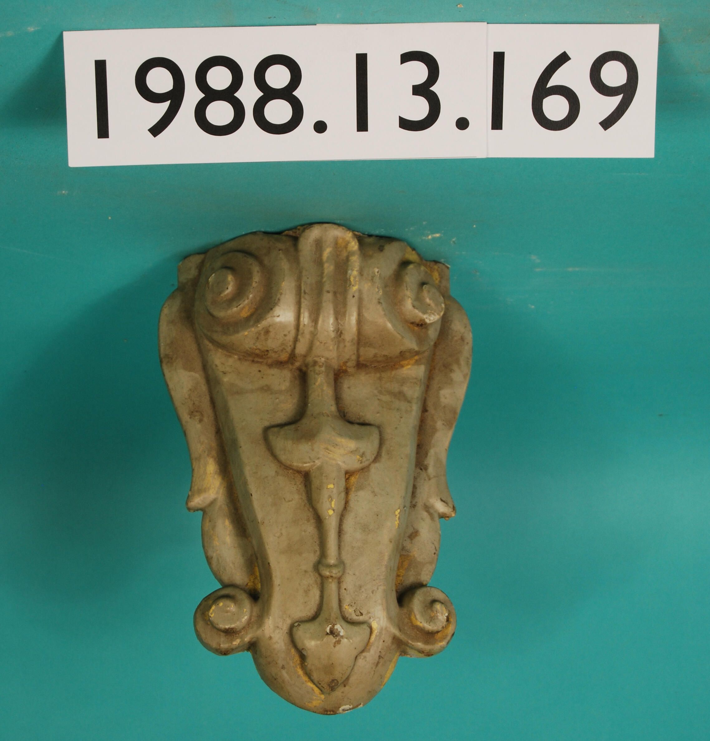 Carved white marble fireplace mantle keystone. Scroll motif. Multiple coats of paint. Outwardly gray.