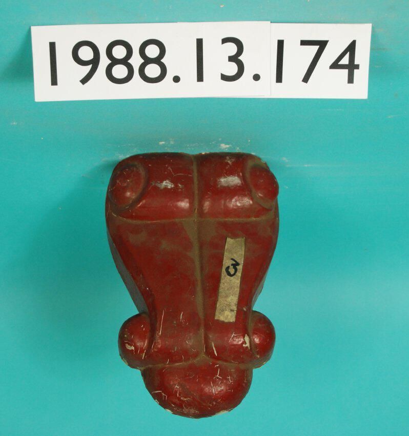 Carved white polished marble keystone with scrolled motifs. Painted reddish brown. From Mantle.