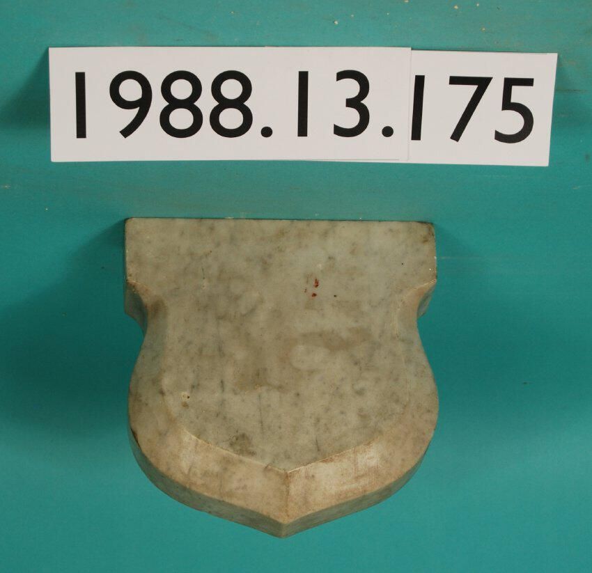 Carved white / gray veined polished marble fireplace mantle keystone. Shield-shaped.