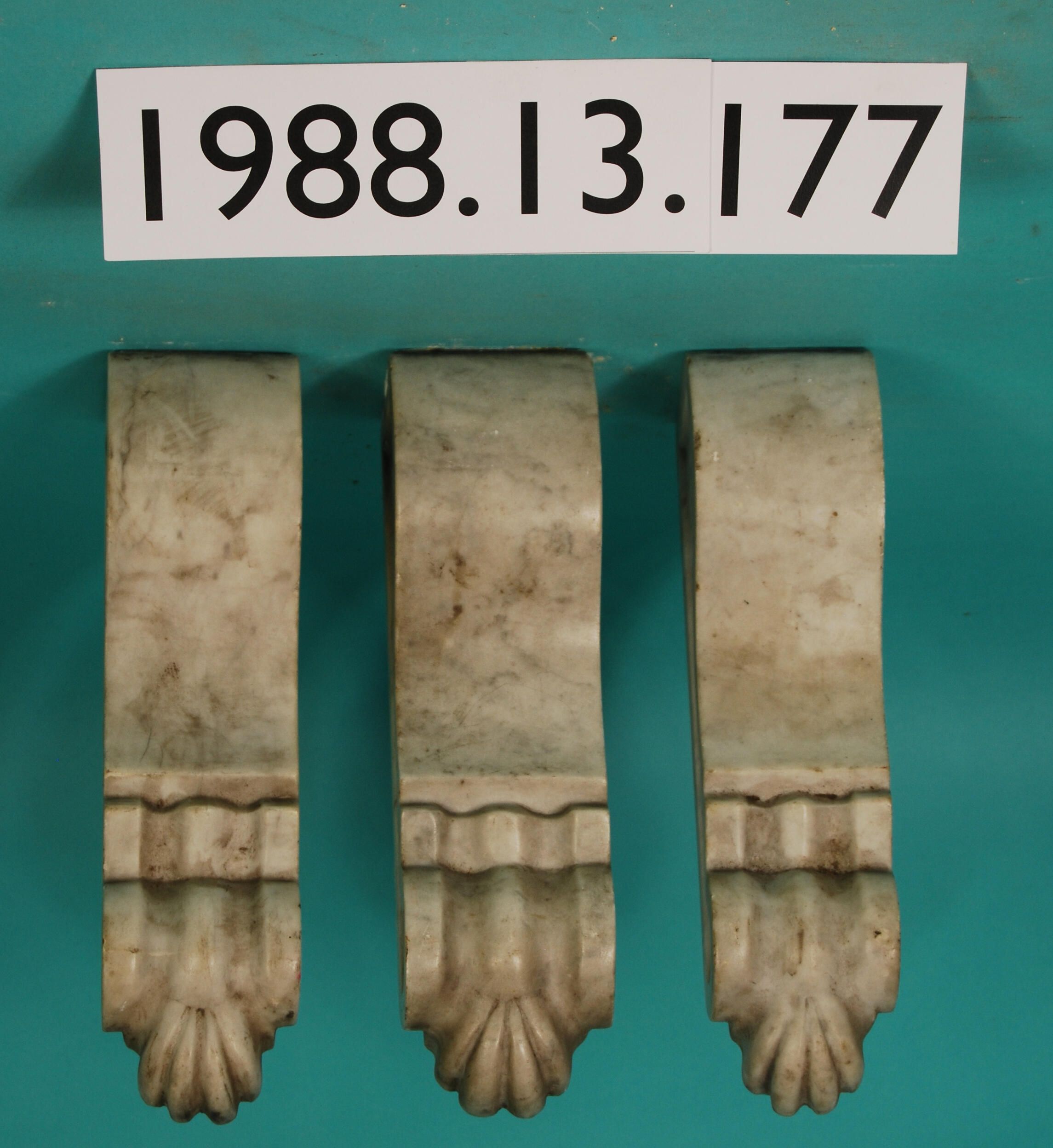 One set of three white / gray veined polished marble brackets. Partial fluted front. Concave panels at sides. From fireplace mantle.