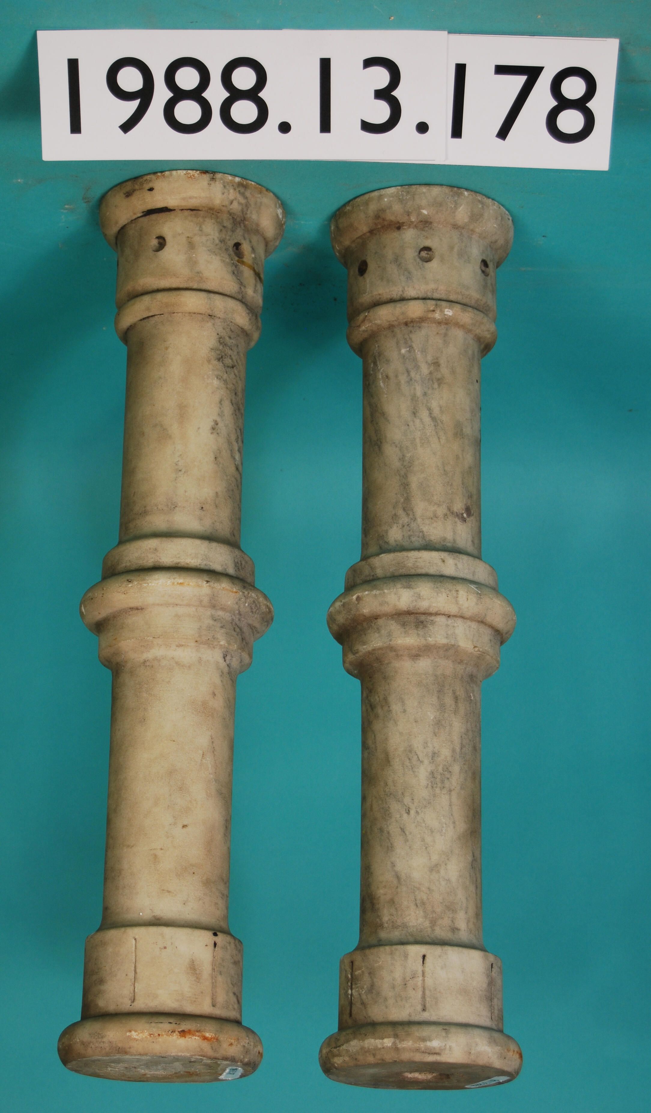 Two white / gray veined polished marble fireplace parts / columns. Lathe turned. Ballaster-shaped.