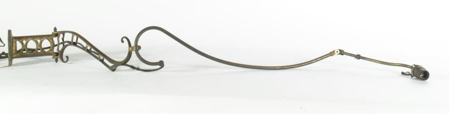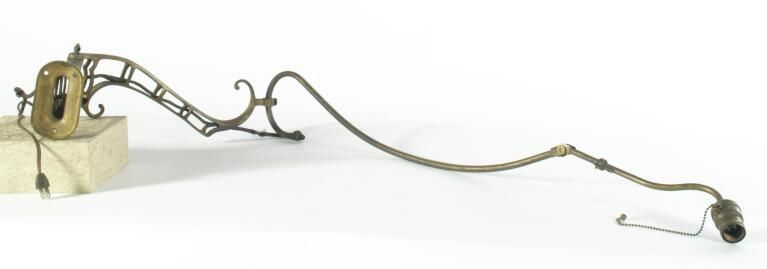 Classic Vernacular brass wall bracket. "Fairies Portable" adjustable height; 2 swinging arms with light socket at end. Shades: None Fuel: Electric Finish: Brushed