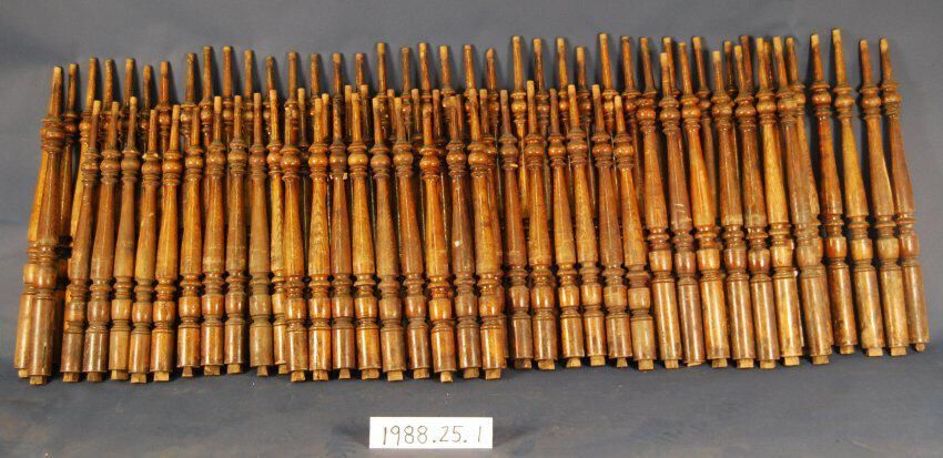One lot of Eighty-One turned stair balusters. Ash wood. Varnished. Two ranges of heights. One baluster is truncated. Some have minor damage. Thirty-Four Short and Forty-Steven Longer Balusters for a total of Eighty-One.