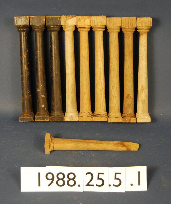 One lot of Ten turned stair balusters. Tapered shank in shape of classical revival column. See (1988.25.5). Later modified by cutting. Three have original varnished finish. Seven are stripped. Made of ash wood.