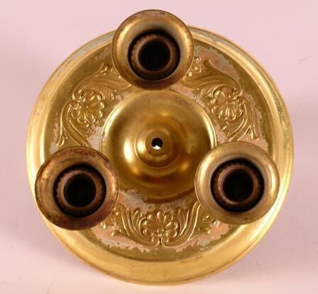 Classical / Beaux Arts stamped brass ceiling flush mount. 3 lights. Shades: Fuel: Electric Finish: Once Polychrome; other