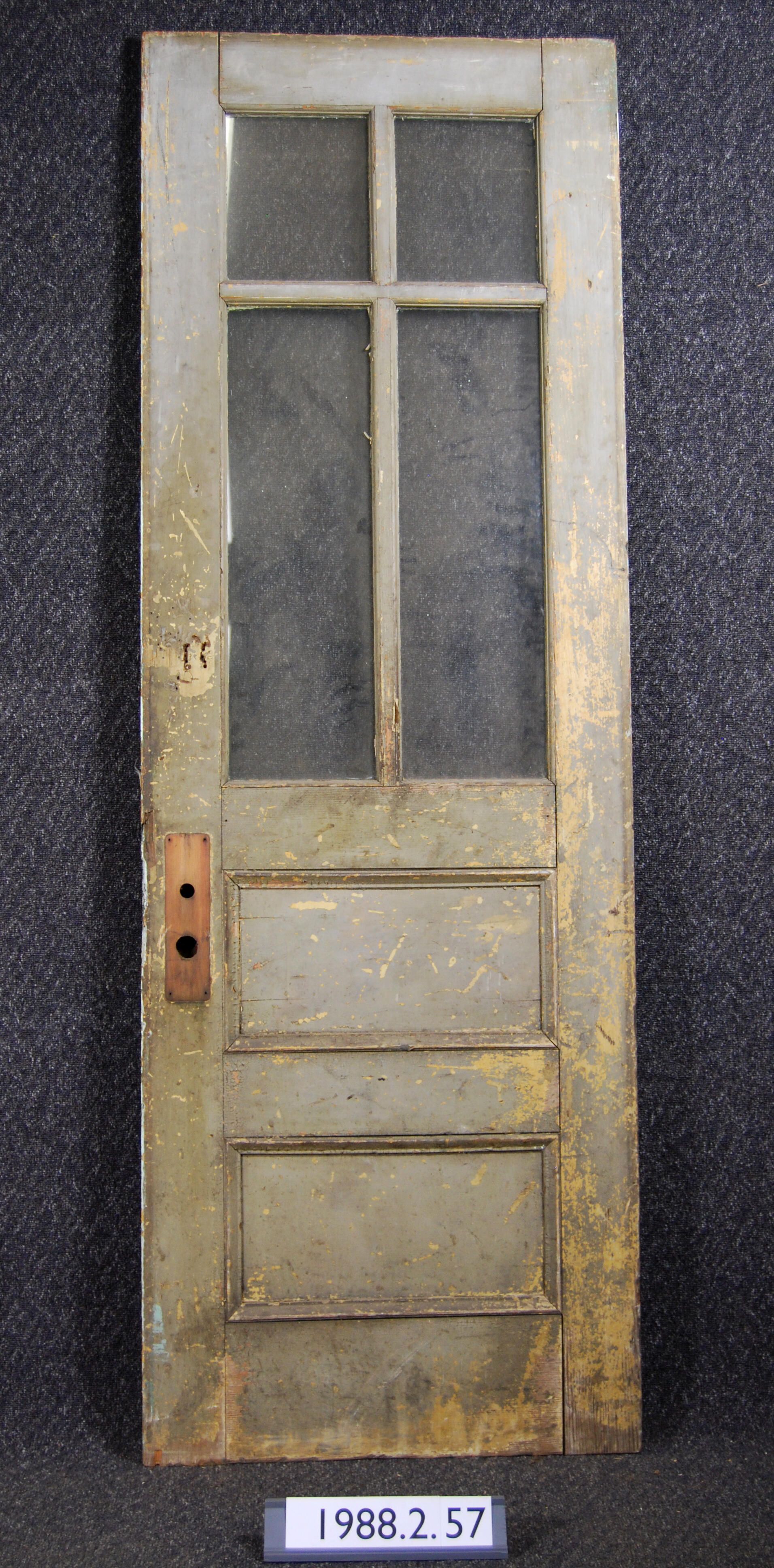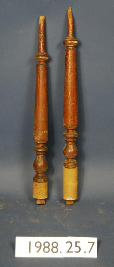 One lot of Two turned stair balusters. Bottom ends are round with dove-tailed tenons. Made of ash wood. Varnished. Lower end painted tan. One end of one baluster is truncated.