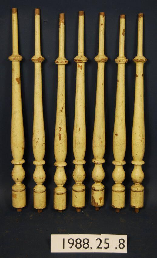 One lot of Seven turned stair balusters. Lower ends are round with round tenons. Made of maple. Originally varnished. Now painted cream colored.