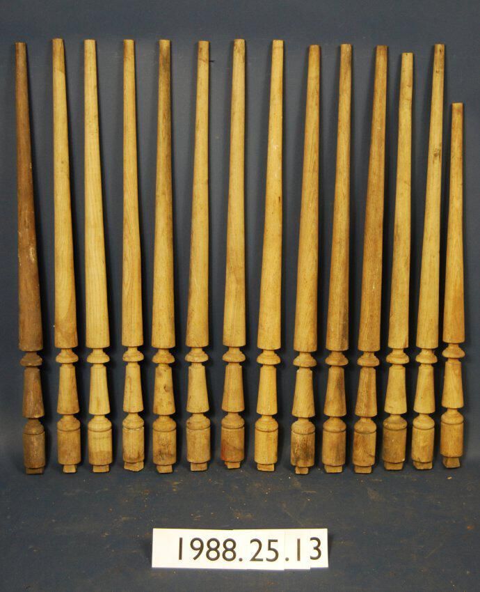 One lot of Fourteen turned stair balusters. Bottom ends are round with dove-tailed tenons. Made of ash wood. Originally varnished, now stripped. One baluster is truncated.