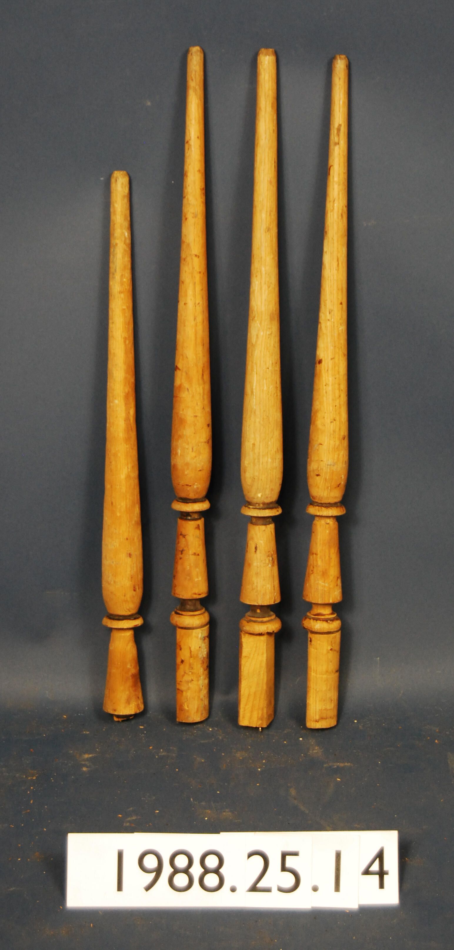 One lot of Four turned stair balusters. Lower ends have been modified. One baluster truncated. Made of ash wood. Originally varnished, now partially stripped.