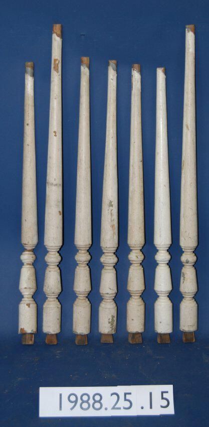 One lot of Seven turned stair balusters. Bottom end is round with dove-tailed tenon. One baluster is broken. Made of ash wood. Originally varnished. Now painted white. Range of heights.