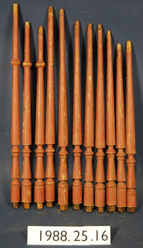 One lot of Nine turned stair balusters. Bottom ends are round with irregular tenons. Appears to be made from douglas fir. Variation in design. Range of heights. Originally varnished. Now painted reddish-brown.