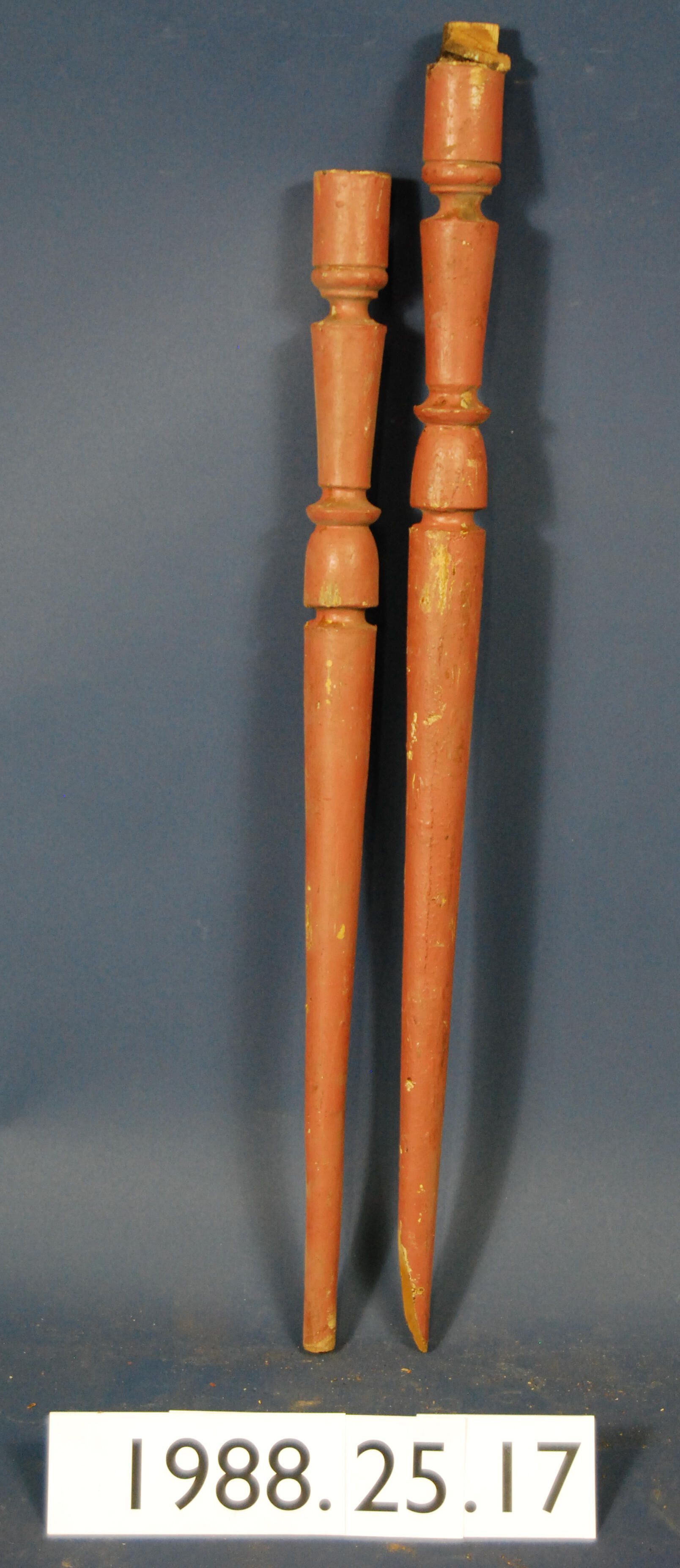 One lot of Two turned stair balusters. Bottom ends are round. Made of ash wood. Originally varnished. Now painted reddish-brown. Matches (1988.25.16) in color but not pattern