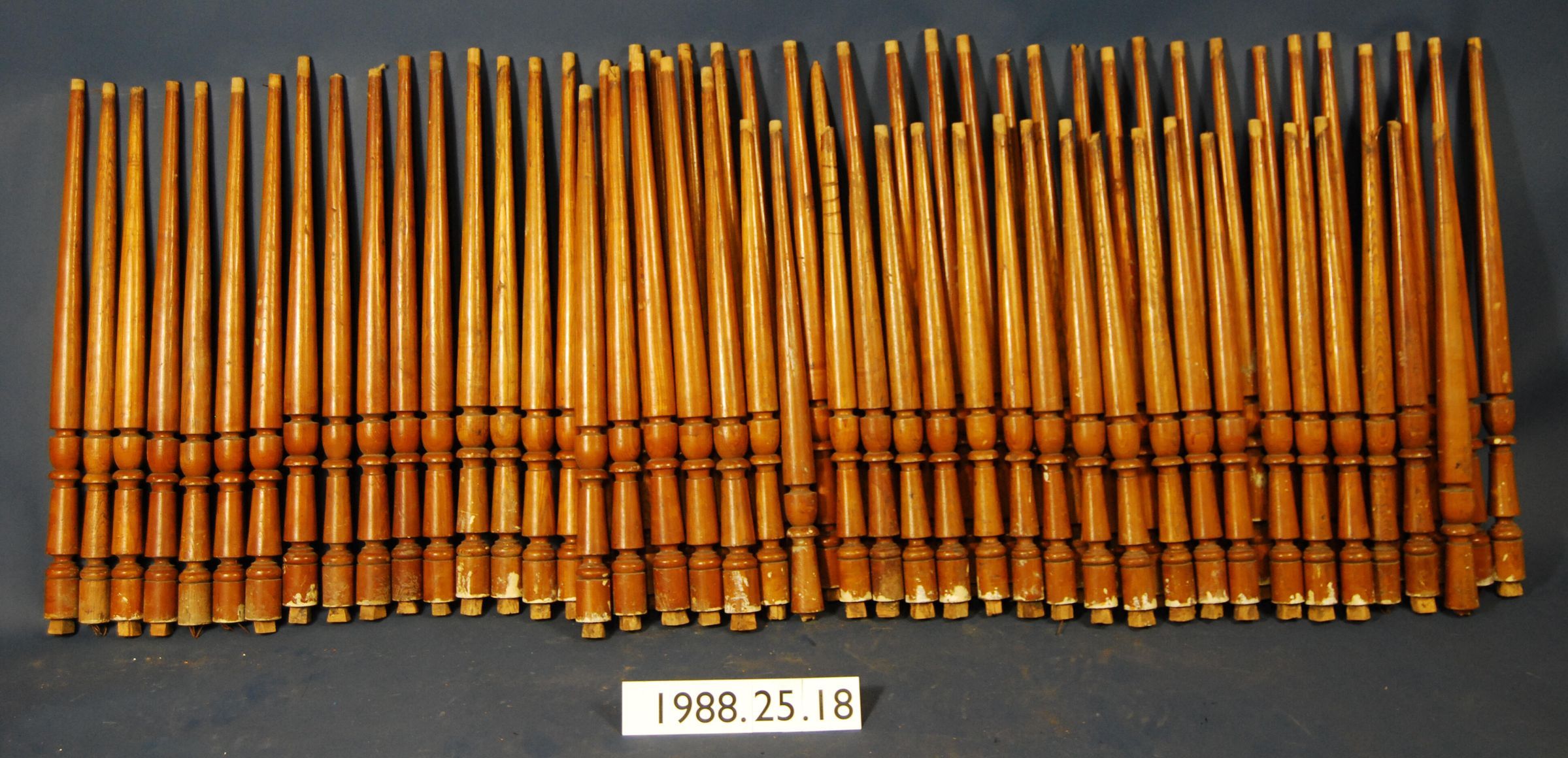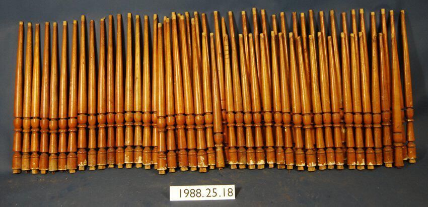 One lot of Sixty-Seven turned stair balusters. Two ranges of lengths. One of the longer balusters is truncated near bottom. One of shorter balusters truncated near top. Design includes urn-shaped motif. Made of ash wood with varnished finish. Some original wire nails attached. Forty-Eight Longer Balusters and Eighteen Shorter Balusters.