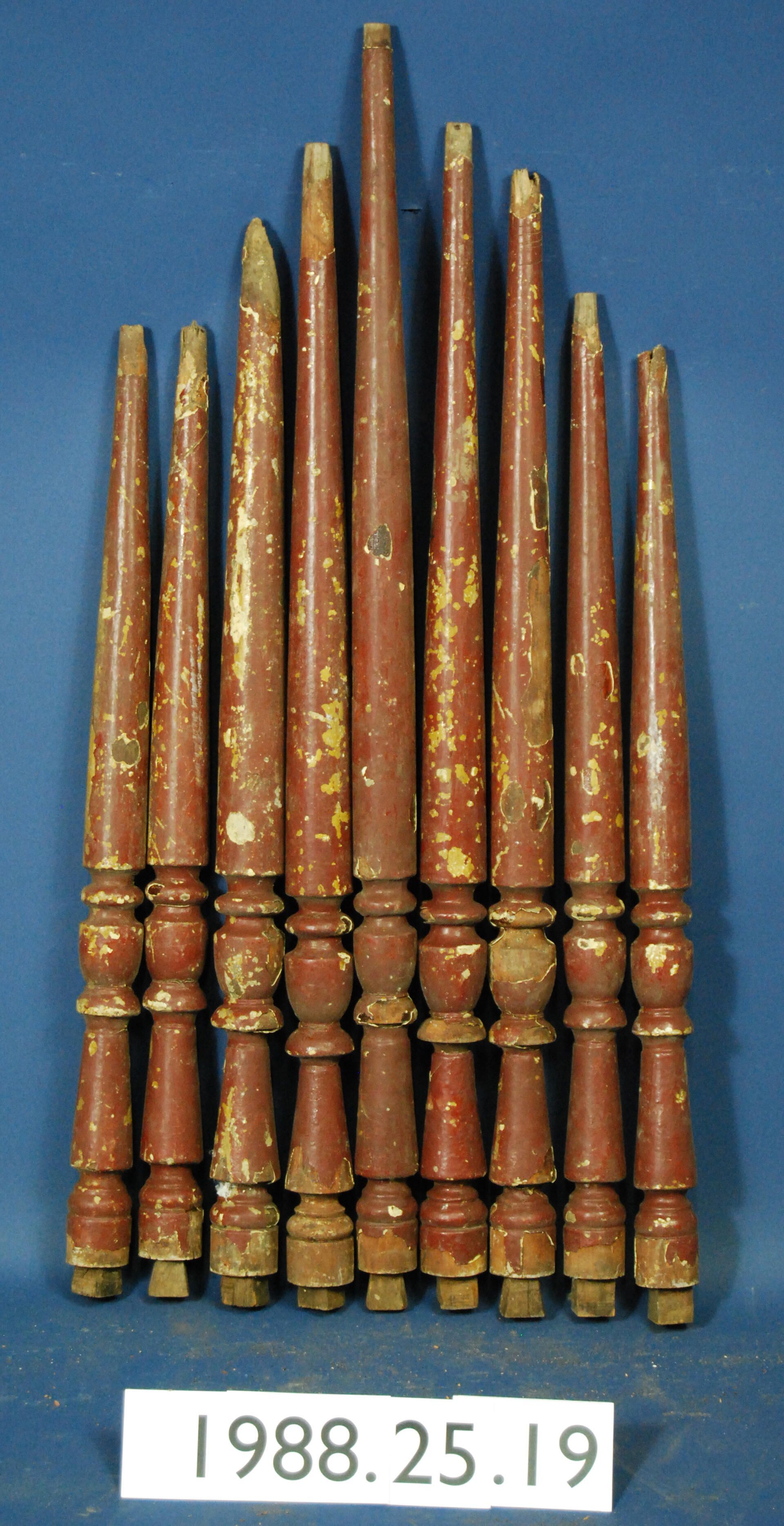 One lot of Nine turned stair balusters. Lower end is round with dove-tailed tenon. Has urn-shaped motif. Range of lengths. Probably alder or maple. Originally varnished. Now painted reddish-brown.