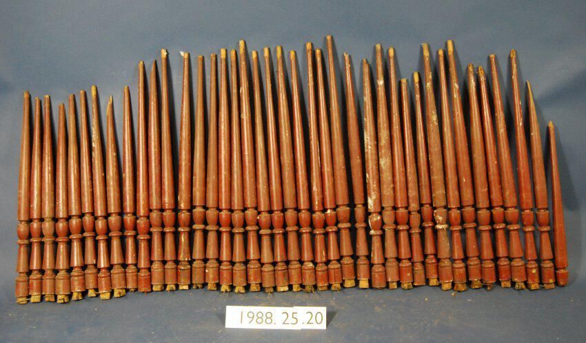 One lot of Forty turned stair balusters. Urn-shaped motif. Range of heights. All presumed to be made of ash wood and all presumed to be from one origin. One baluster is broken. One is truncated at top. Another is truncated near bottom end. Originally varnished. Now painted reddish-brown.
