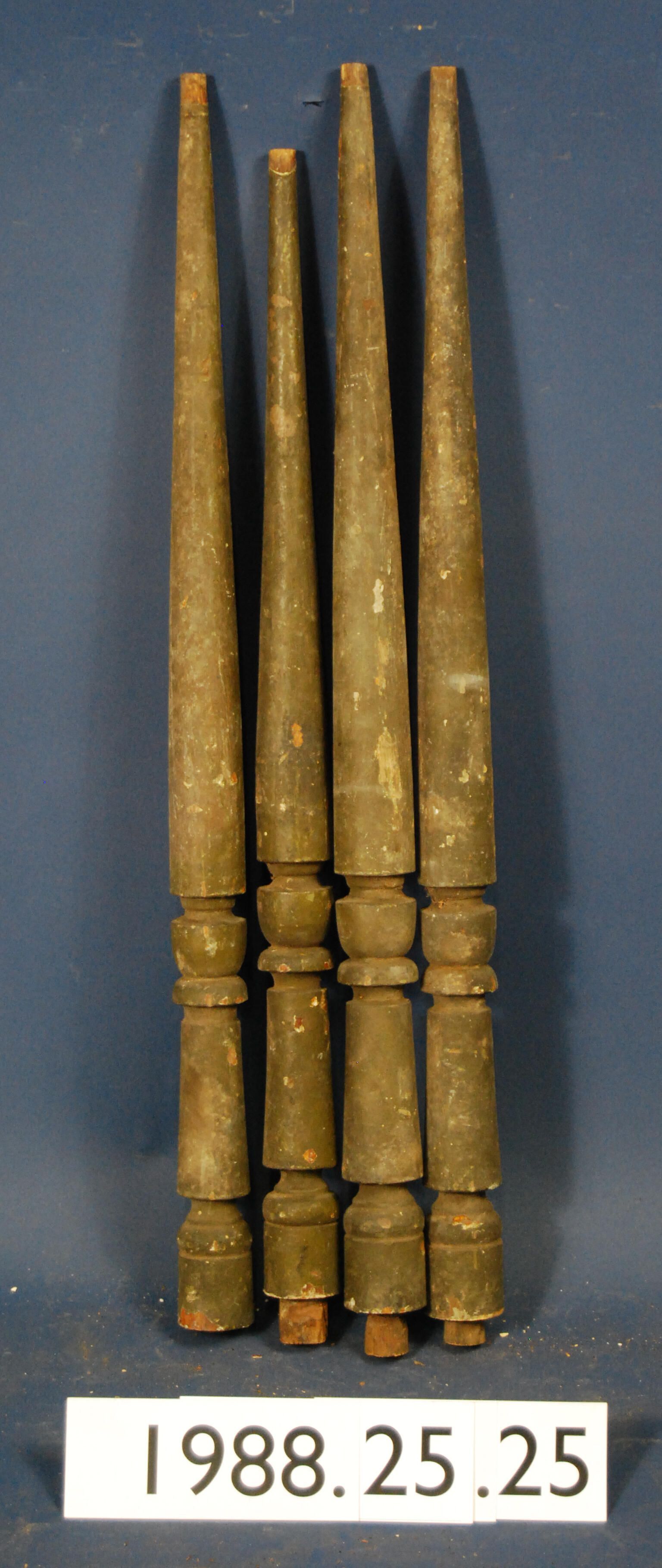 One lot of Four turned stair balusters. Has urn-shaped motif. Painted dull-green. Type: Inscriptions or Markings: Manufacturer: Place of Manufacture: . Design motif: Urn-shaped Style: Finish: Painted Dull-Green