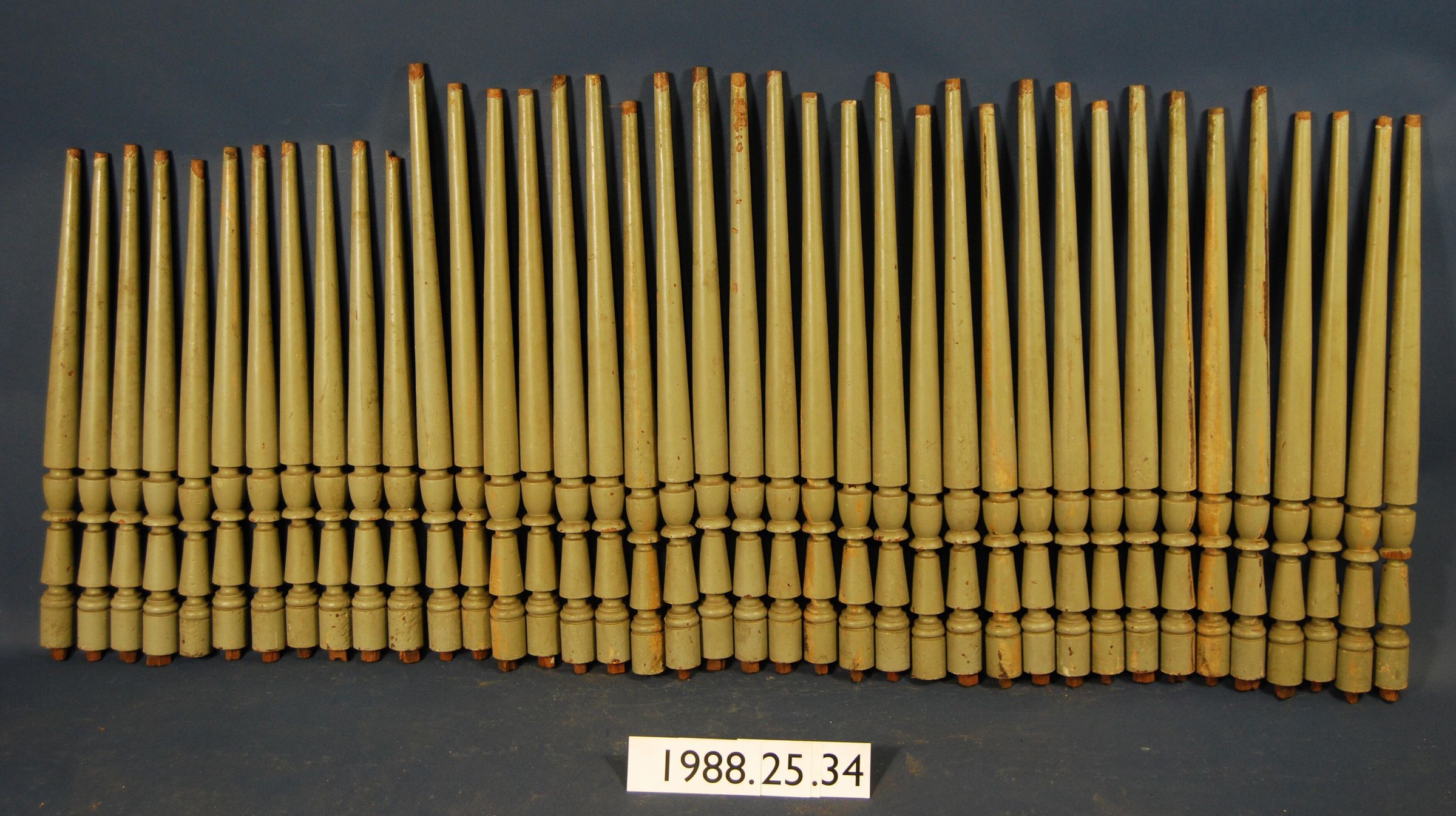 One lot of Thirty-Nine turned stair balusters. Has urn-shaped motif. Range of heights. Originally varnished. Now painted grey. Probably cedar or redwood.