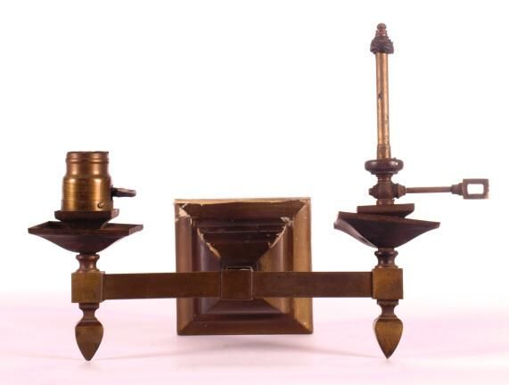 Mission style brass wall bracket. 1 electric and 1 gas on 1 arm. Shades: Other Fuel: Combination Gas/Electric Finish: Aged