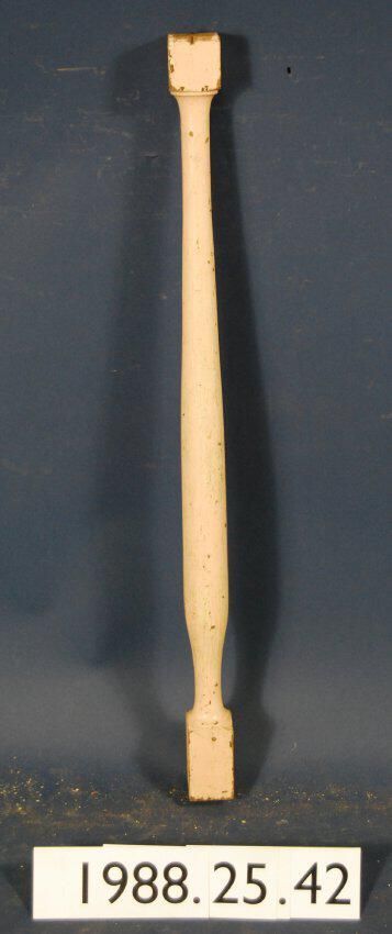 One turned stair baluster. Single hardwood baluster. Probably ash. Painted pink. Type: Inscriptions or Markings: Manufacturer: Place of Manufacture: . Design motif: Style: Finish: Painted Pink