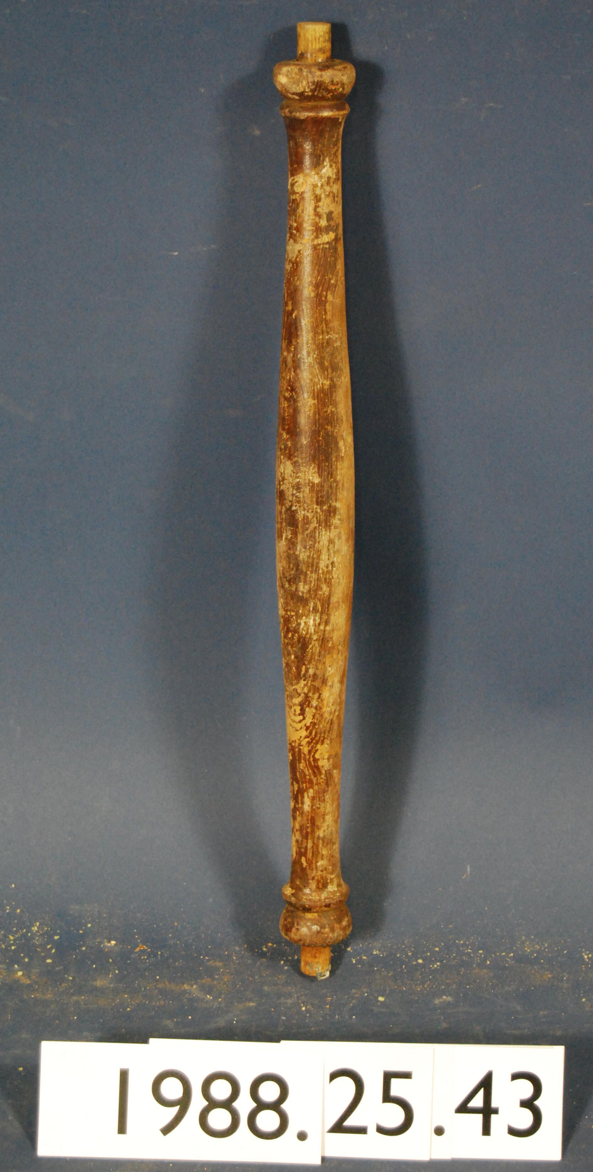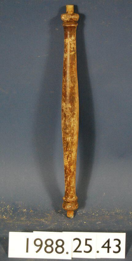 One turned stair baluster. Single hardwood baluster. Has round tenon at both ends. Presumed to be baluster -- could be furniture part?? Varnished / stripped.