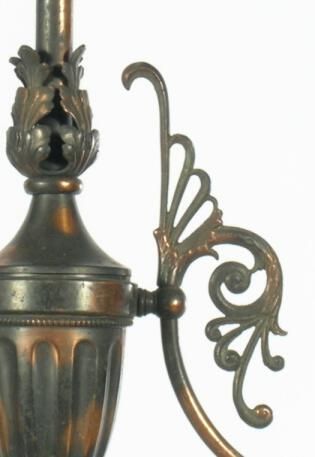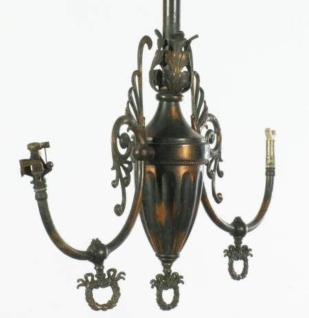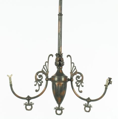 Empire style brass ceiling chandelier. 2 arm; tiger stripe finish; wreath finials.