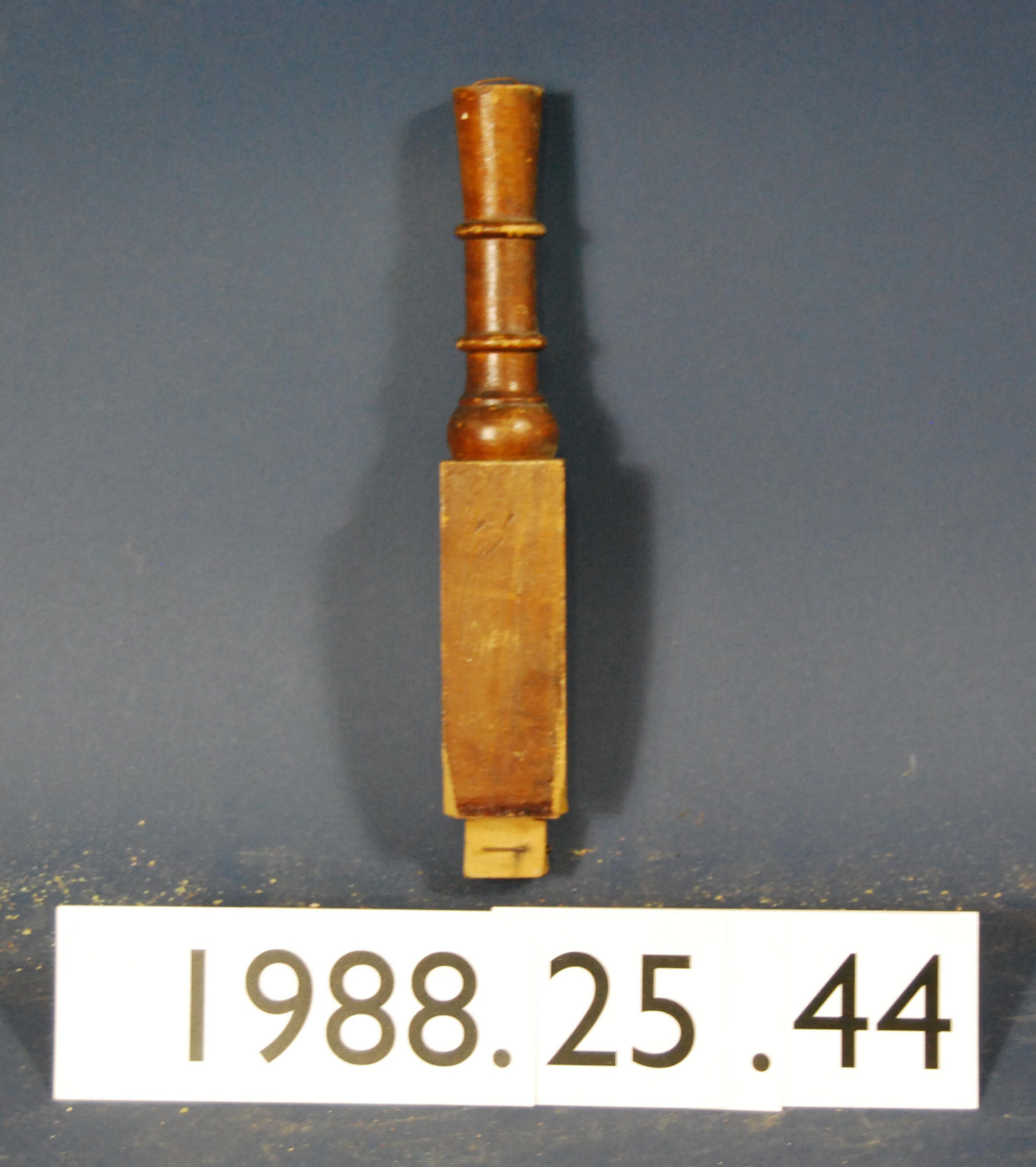 One turned stair baluster. Single segment of baluster. Dove-tailed tenon at bottom end. Trimmed at top. Probably ash. Varnished. Type: Inscriptions or Markings: Manufacturer: Place of Manufacture: . Design motif: Style: Finish: Varnished