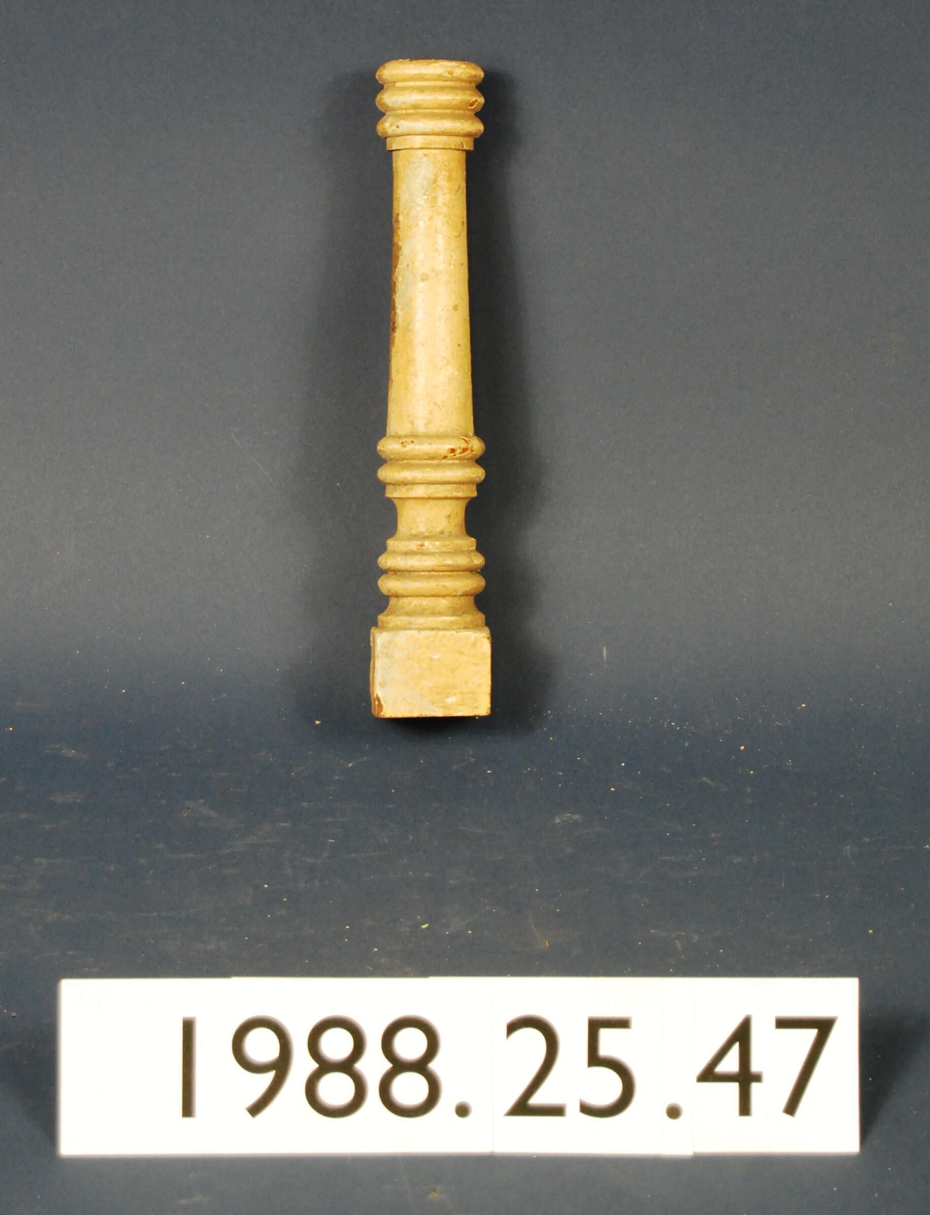 Single turned stair baluster. Made of ash. wood. Originally varnished, now painted off-white / yellow. Later modified (saw-cut) at both ends.
