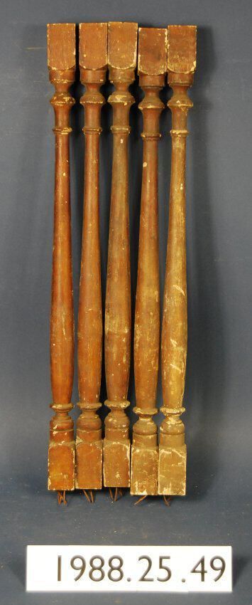 One lot of Five turned stair balusters. Probably from landing. Made of ash wood. Originally varnished. Now painted. Type: Inscriptions or Markings: Manufacturer: Place of Manufacture: . Design motif: Style: Finish: Originally Varnished. Now Painted.