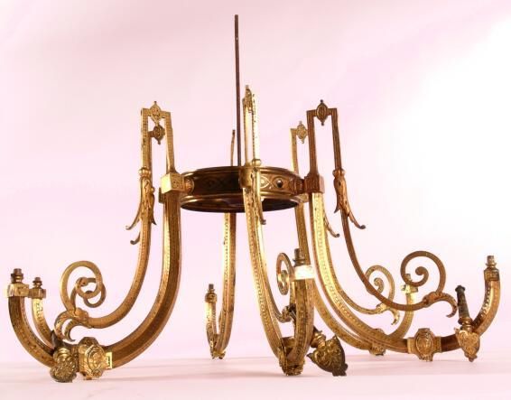 Brass ceiling chandelier (parts). 7 arms; flat design; Eastlake/Aesthetic inspired;