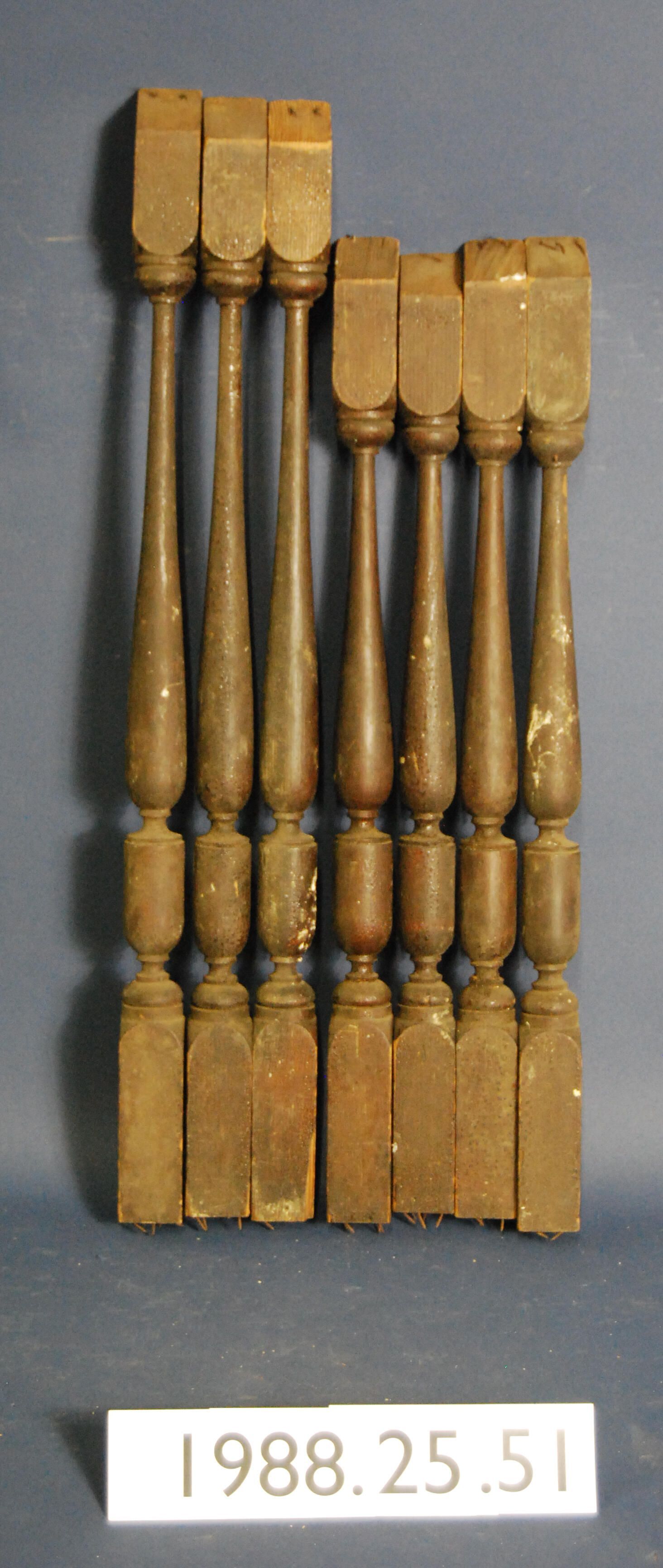 One lot of Seven turned stair balusters. Urn-shaped motif. Two different heights within group. Angle-cut at top end. Softwood. Varnished.