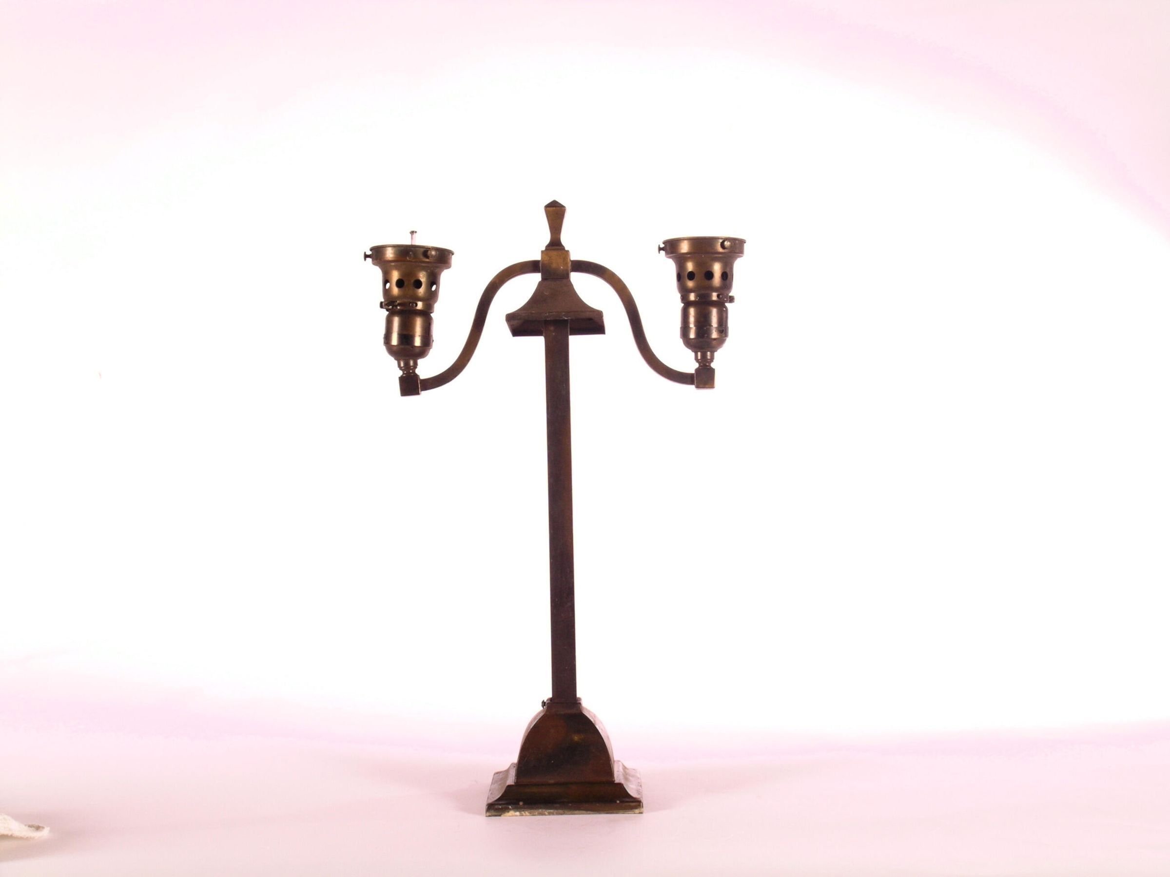 Mission style brass ceiling pendant. 2 arms, 1 light each, from central rod.