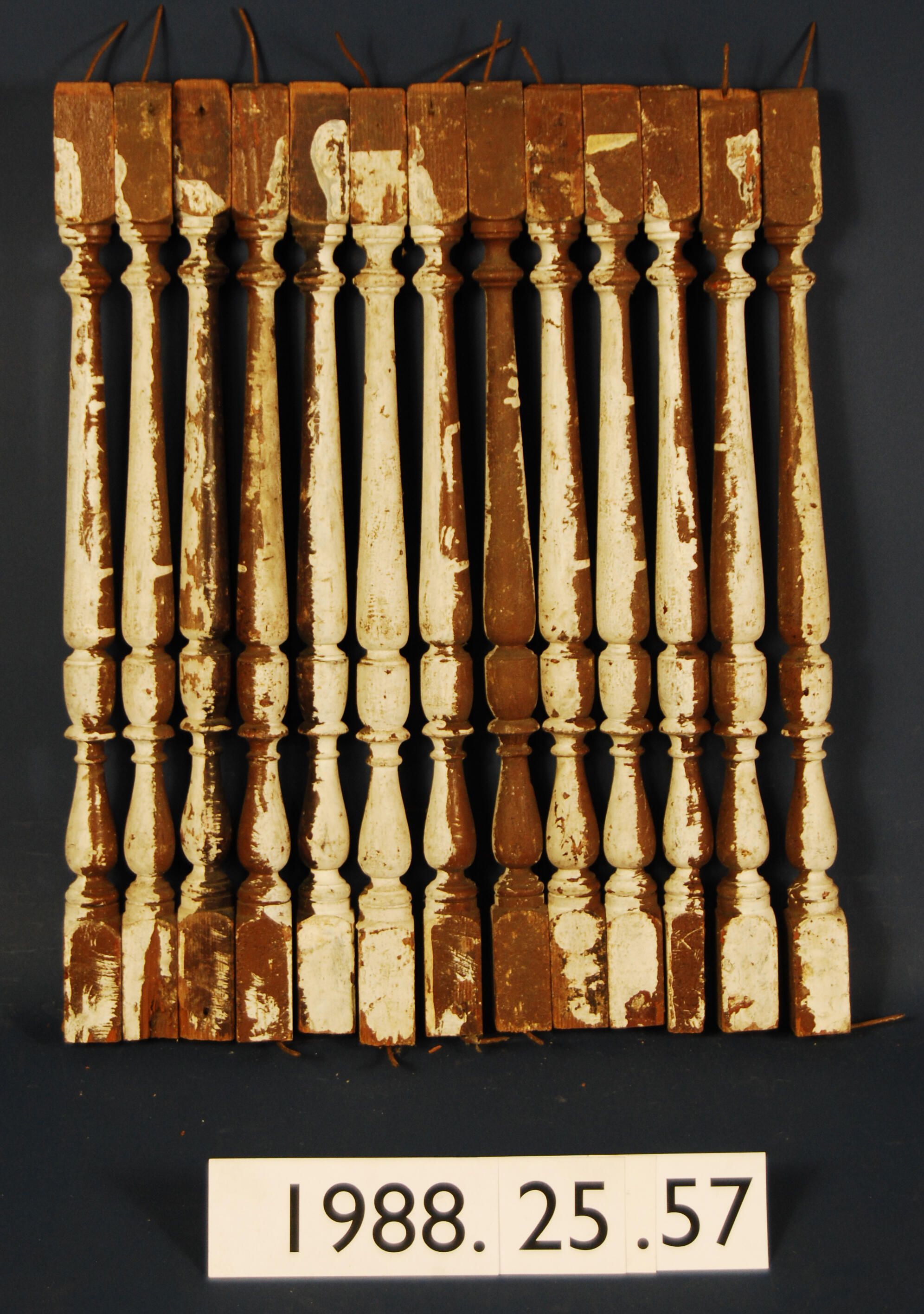 One lot of thirteen turned stair (?) balusters. Made of softwood. Painted brown and white. Type: Inscriptions or Markings: Manufacturer: Place of Manufacture: . Design motif: Style: Finish: Painted Brown and White