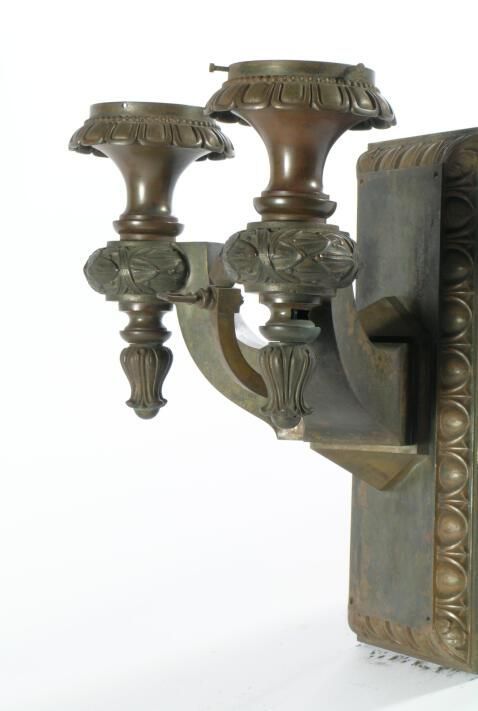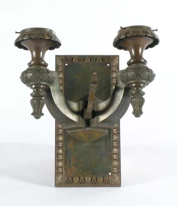 Neoclassical style bronze wall bracket. 2 arm with ribbon & bay motif. Unusual single gas jet at center of bracket. Very High Quality