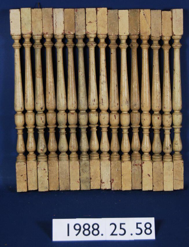 One lot of sixteen turned stair (?) balusters. Made of softwood. Painted tan colored. Type: Inscriptions or Markings: Manufacturer: Place of Manufacture: . Design motif: Style: Finish: Painted Tan