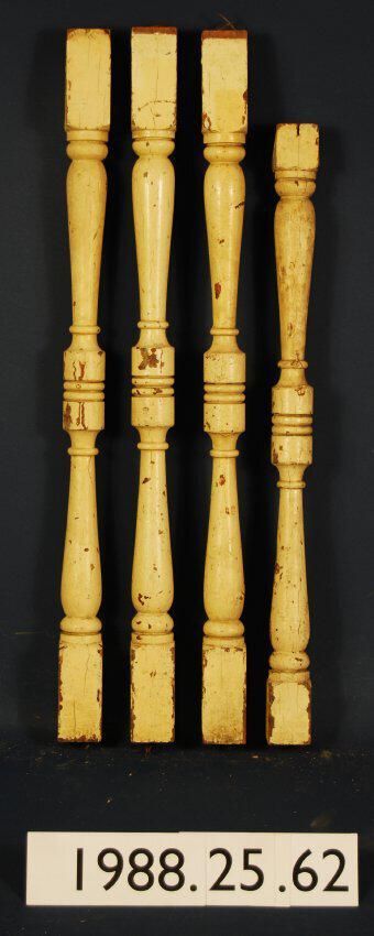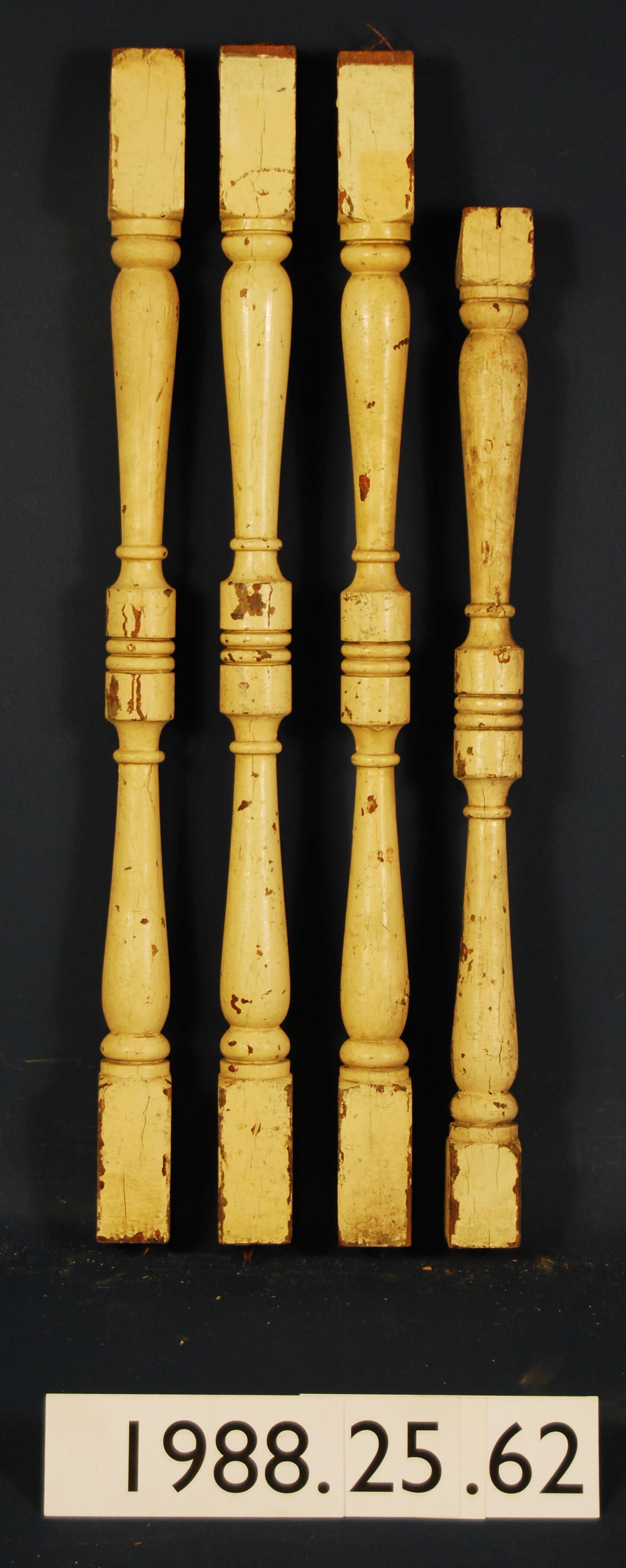 One lot of Four turned stair balusters. Range of two heights. Made of softwood. Originally varnished. Now painted yellow.