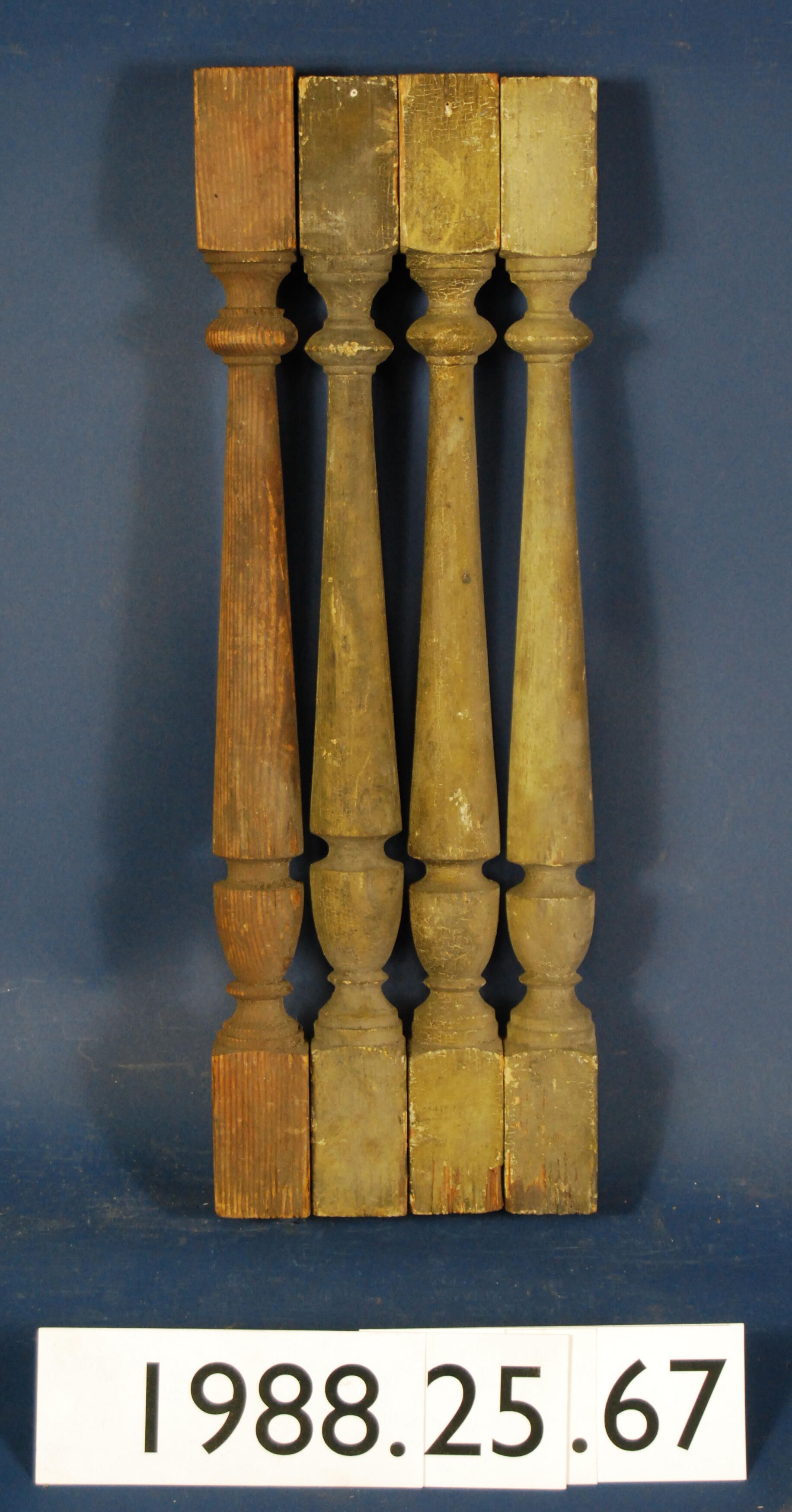 One lot of four turned stair (?) balusters. Made of softwood. One has never been finished. The other three are painted grey.