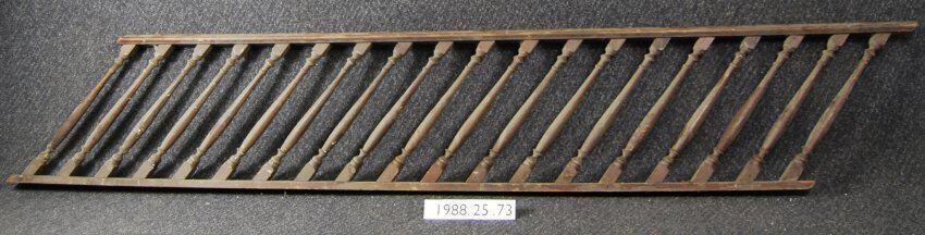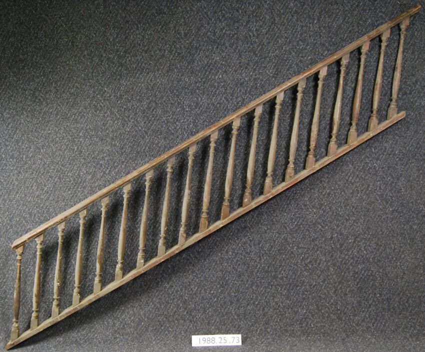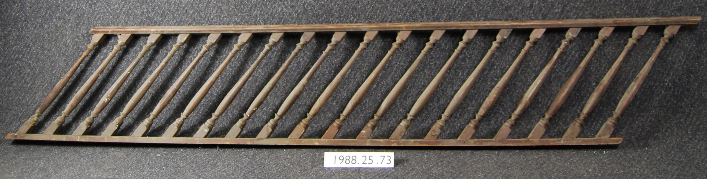 Interior stair balustrade, composed of nineteen balusters. Hand rail and bottom rail joined together and set at angle for riser. Made of softwood. Varnished.