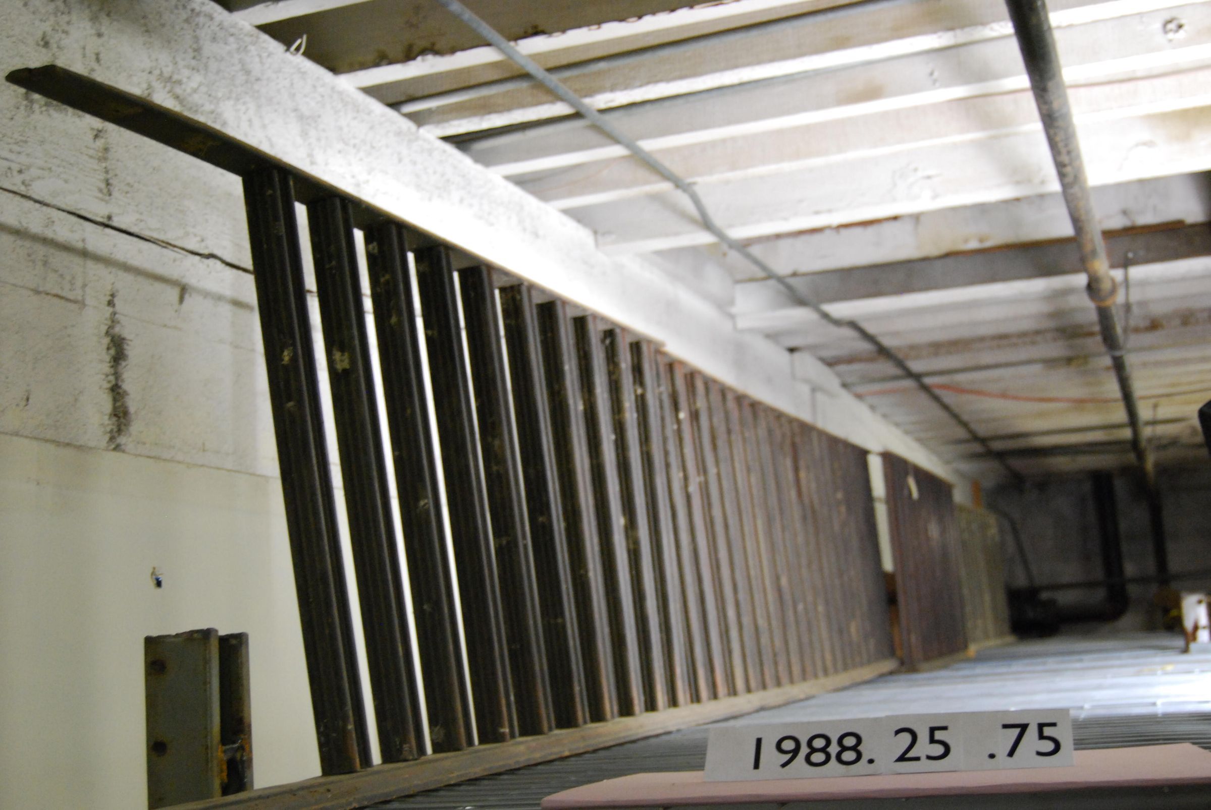 Stair balustrade. Composed of three detached sections of differing lengths but same height. Each section has series of square balusters with compound molding profile. Made of ash wood. Varnished Finish.