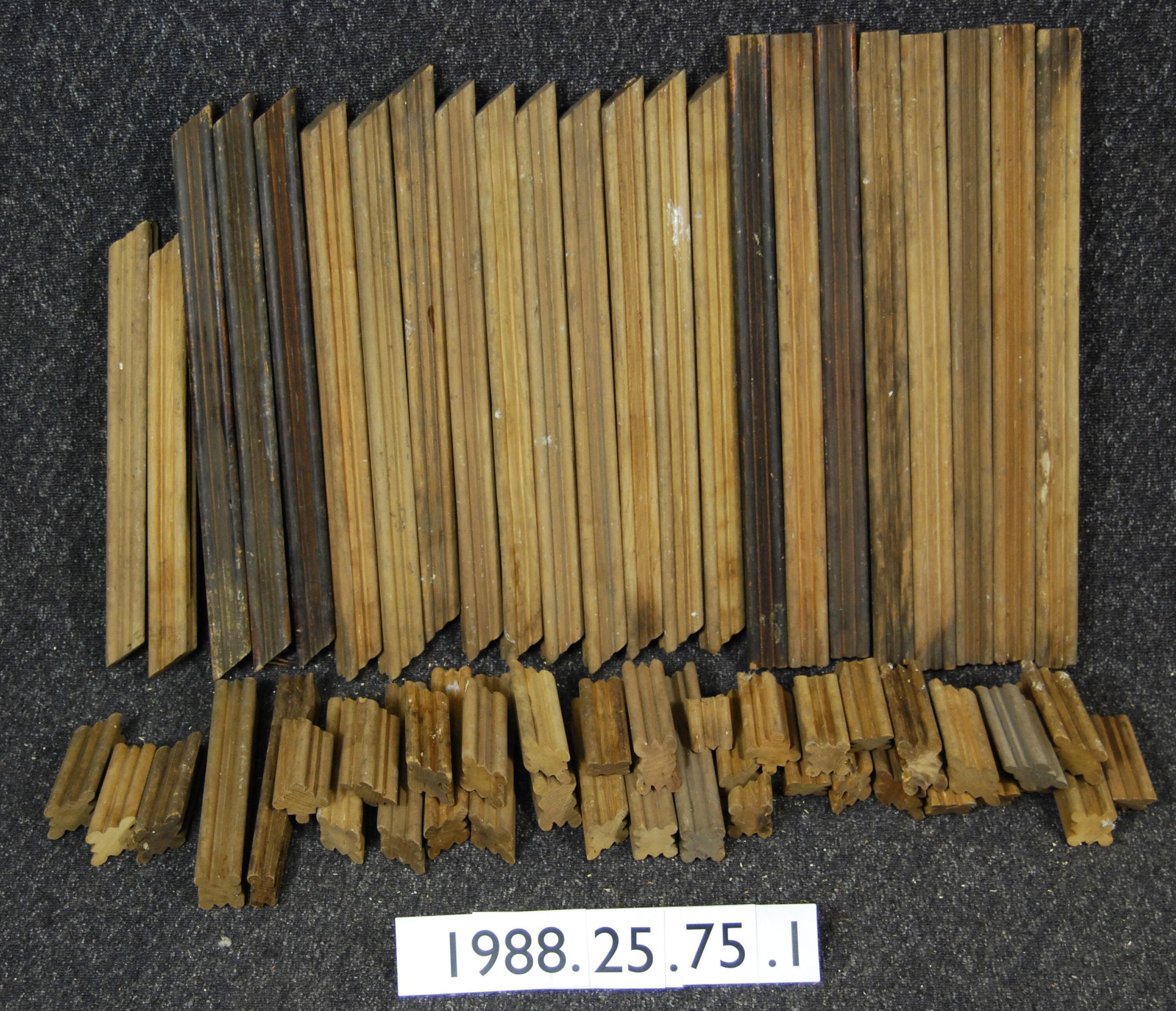 One lot of sixty-five square, compound molded stair balusters. Of the total, twenty-four are complete and full length. The remaining forty-one are modified - short scraps. All are made of ash wood. Few have original varnished finish. Remainder have been stripped.