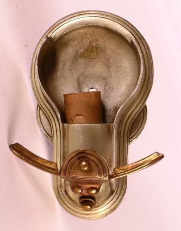 One of four. Streamline/Moderne style aluminum wall bracket with a "nautical" look to them. Shades: 1 5/8" Fuel: Electric Finish: Plated