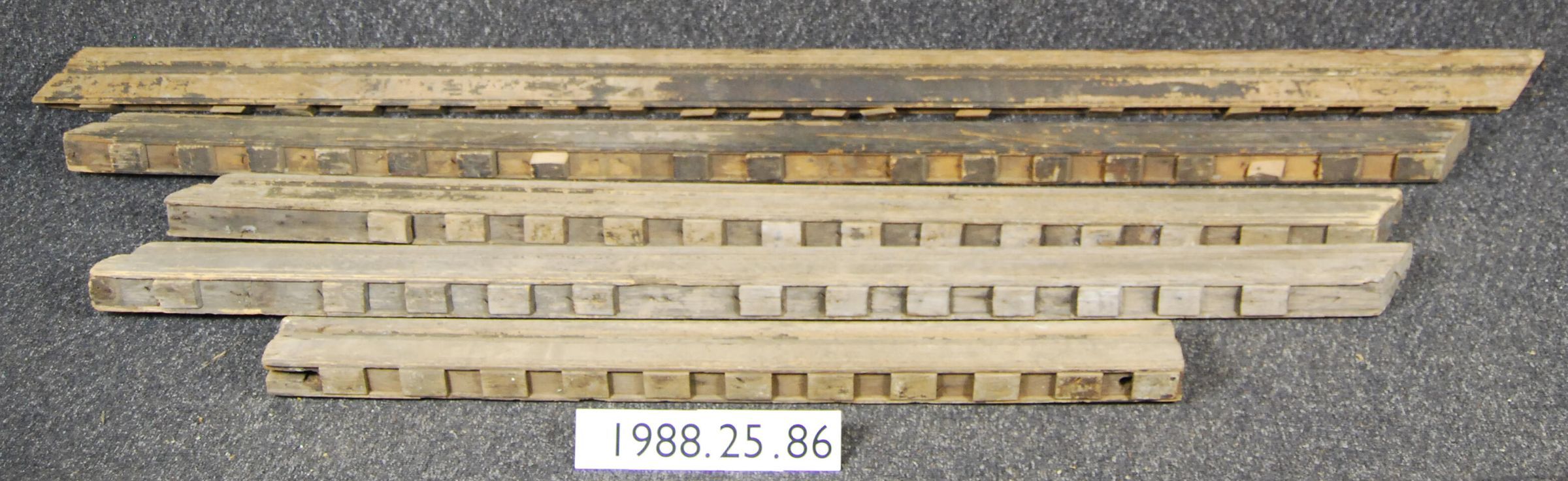 One lot of five stair handrails. Compound molding profile. Made of ash wood. Varnished.
