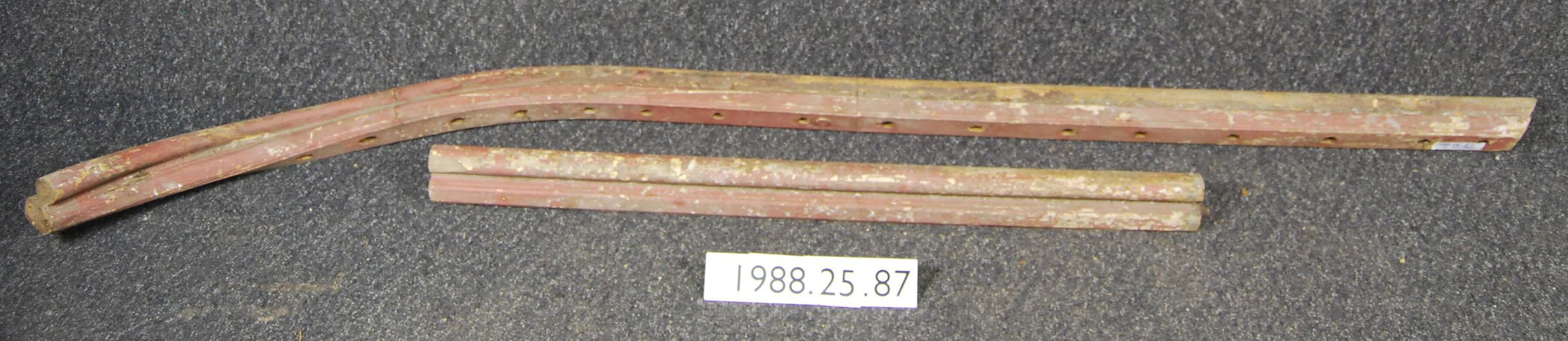 One lot of two stair handrails. Compound molding profile. Longer section has spiral curvature. Made of ash wood. Originally varnished. Now painted reddish-brown.